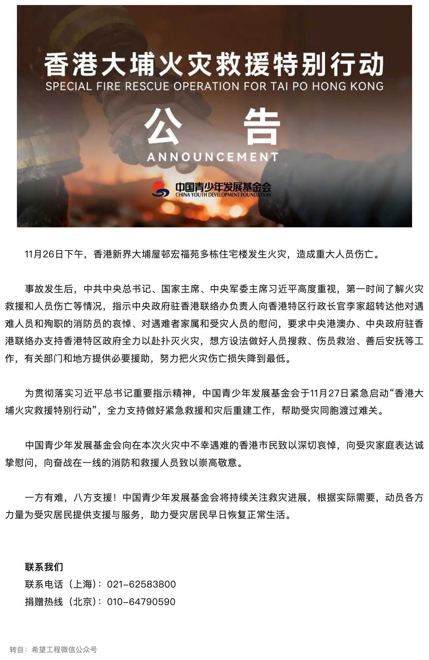 驰援香江——中国青少年发展基金会启动“香港大埔火灾救援特别行动”公告