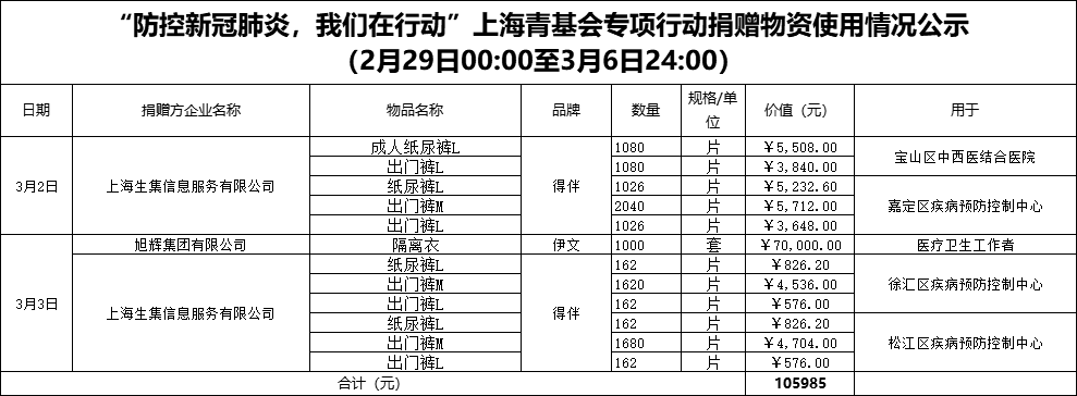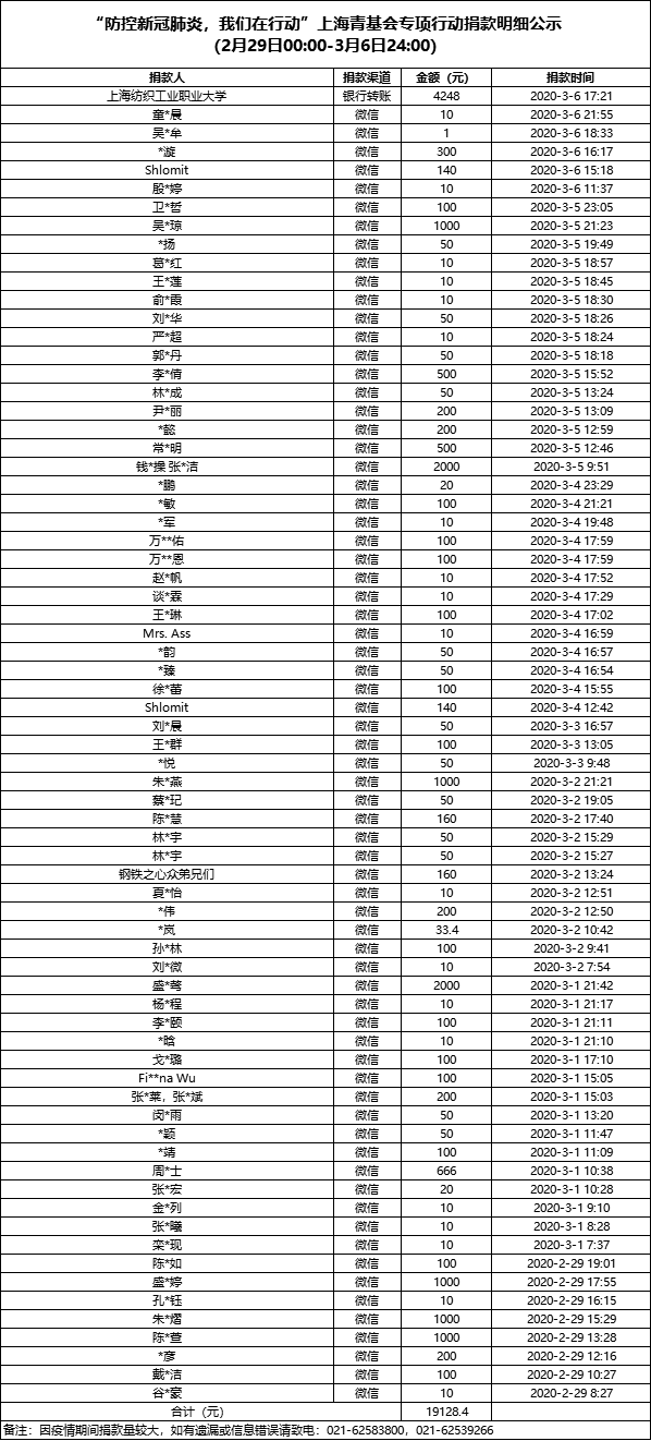 “防控新冠肺炎,我们在行动”上海青基会专项行动捐助明细公示(2月29日-3月6日)