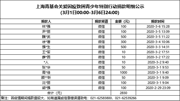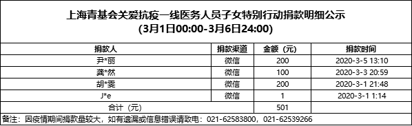 关爱抗疫一线医务人员子女及因疫致困青少年特别行动捐助明细公示(3月1日-3月6日)