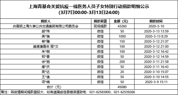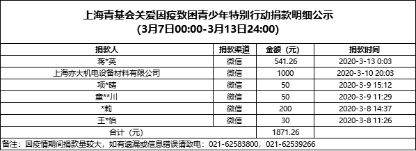 关爱抗疫一线医务人员子女及因疫致困青少年特别行动捐助明细公示(3月7日-3月13日)
